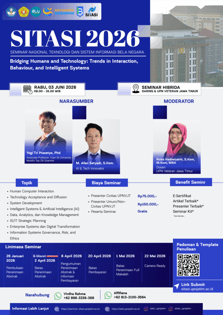 Seminar Nasional Teknologi dan Sistem Informasi (SITASI) hadir sebagai ruang temu ilmiah tahunan yang menjadi ajang refleksi, diseminasi, dan tukar gagasan atas berbagai isu terkini di bidang teknologi dan sistem informasi. Sejak pertama kali diselenggarakan, SITASI telah menunjukkan konsistensinya dalam menghadirkan tema-tema yang responsif terhadap dinamika sosial dan kebijakan nasional. Sebagai kelanjutan dari perjalanan, SITASI 2026 mengangkat tema “Bridging Humans and Technology: Trends in Interaction, Behaviour, and Intelligent Systems”. Kegiatan SITASI dilaksanakan oleh Program Studi Sistem Informasi, Fakultas Ilmu Komputer, Universitas Pembangunan Nasional Veteran Jawa Timur. Semua paper yang lolos seleksi akan diterbitkan di proceeding SITASI yang telah memiliki ISSN dan diindex Google Scholar. Selected Paper akan dipublikasikan ke Jurnal Penelitian Sinta 5.